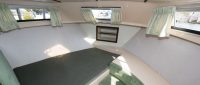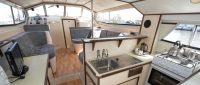 Crown of Light is part of our Connoisseur range, offering two double cabins and one bunk bed cabin, each with its own bathroom. The central raised steering area has a fully sliding canopy, operated by a winch, to provide a light and spacious feel. The kitchen is equipped with an undercounter fridge with a small freezer and gas cooker, while the saloon seating can be converted into a double bed for extra sleeping arrangements. Access to the cruiser is via the side deck with steps leading into the galley.