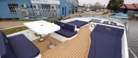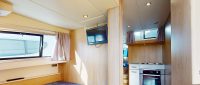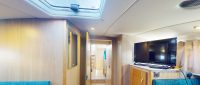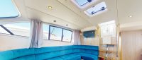 Dazzling Light features an external upper sundeck with a raised steering position, sunbathing platforms, and an alfresco dining area, ideal for entertaining. The saloon is beautifully appointed with a second steering position and a large open-plan galley. The forward cabin includes one single bed and one double bed, while the double cabin has a bathroom opposite. The rear of the boat has a double cabin with an adjacent family bathroom and a twin cabin.