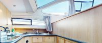 Olympic Light is a modern, high-specification cruiser with dual steering positions. The boat features an external upper deck with a raised steering position and seating to enjoy spectacular views. The saloon is light and spacious, with a raised steering position offering enhanced visibility. The saloon seating can be converted into an additional double bed if needed. The rear cabin is ensuite with a double bed, and an additional forward cabin includes a double bed and a quarter berth suitable for a child. A separate family bathroom with a toilet and shower is also provided.