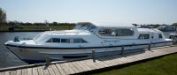 Silver Light features a raised central steering position with a winch-operated full sliding canopy over the saloon. The saloon seating can be converted into an additional double bed if needed. The forward cabin has a double bed with ensuite, and the rear cabin includes twin beds that can be pushed together to form a double, also with ensuite. Access to the boat is via steps from the side deck. Silver Light also includes bow thrusters and shore power.