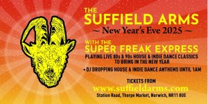 Celebrate in style at The Suffield Arms’ New Year’s Eve Party 2025, featuring a live performance from The Super Freak Express followed by DJs playing a mix of house, indie dance and party classics throughout the night.
